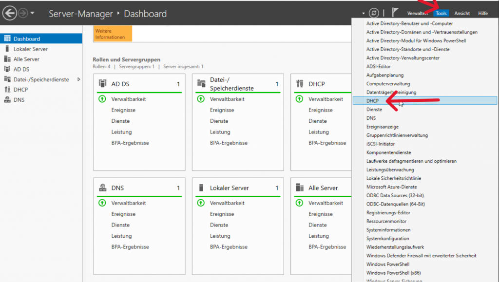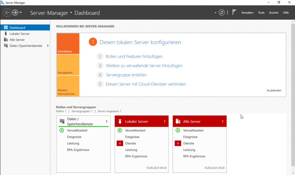 - Alternativ: Start → „Server Manager“ suchen und öffnen