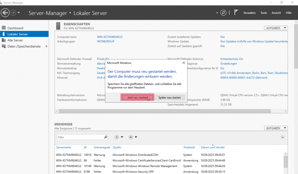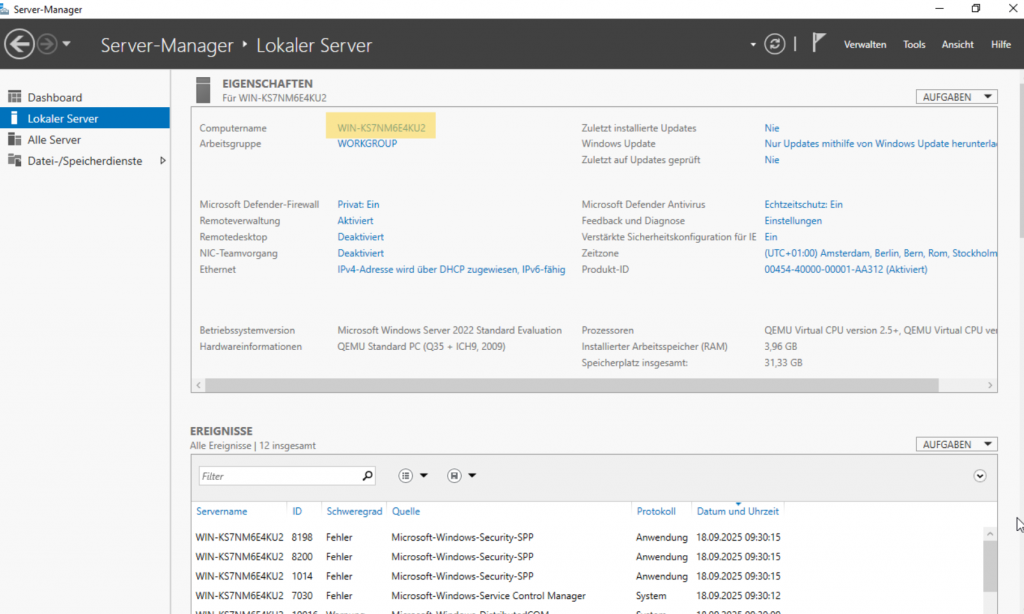 Ein eindeutiger und aussagekräftiger Servername erleichtert die Administration, verhindert Konflikte im Netzwerk und ist besonders wichtig, wenn der Server später Domain Controller wird.