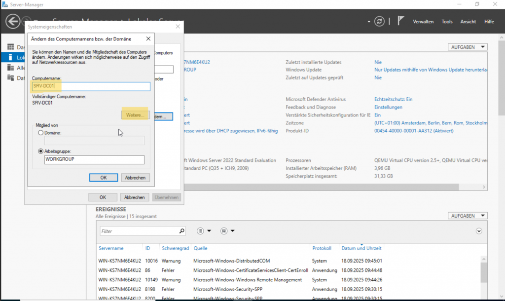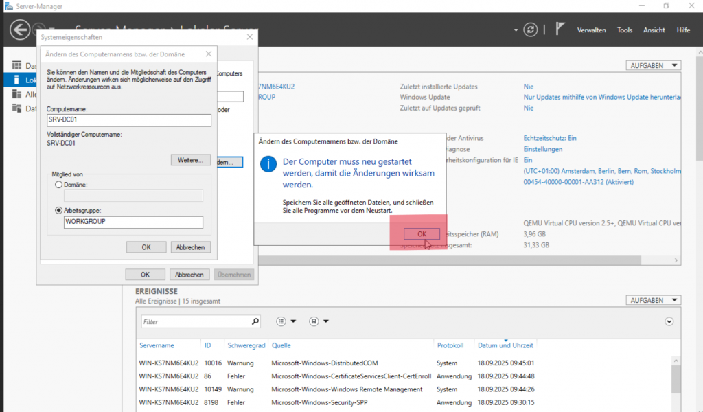 - Eingabefeld „Computer name“ → neuen Namen eintragen: wie z.B SRV-DC01