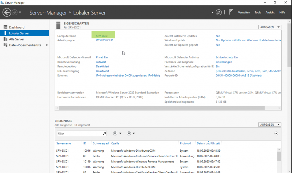 Das Ziel dieses Projektes war die Planung und Implementierung eines Windows Server 2022 Domain Controllers (DC) in einer virtuellen Umgebung.