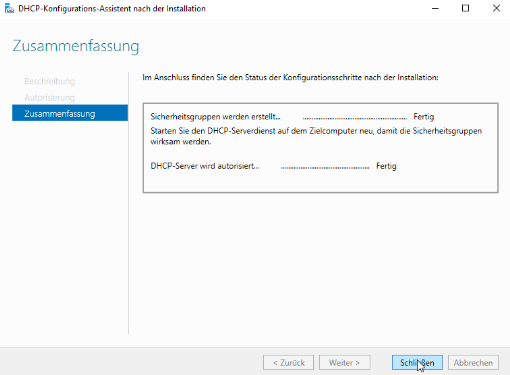 Es steht nun eine funktionsfähige, zentrale Windows-Server-Infrastruktur zur Verfügung, in der Clients automatisiert IP-Adressen erhalten, DNS-Namensauflösung funktioniert und eine Domäne bereitsteht, an der sich Windows-Clients anmelden können. Damit sind die Grundlagen geschaffen, um weitere Dienste wie Benutzer- und Gruppenverwaltung, Gruppenrichtlinien, Dateifreigaben oder Druckdienste einzurichten und zu testen.