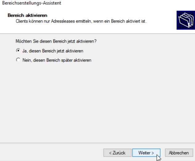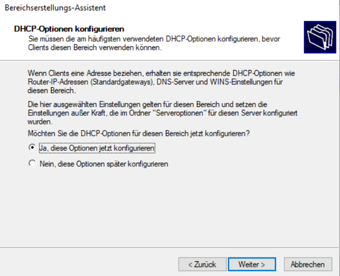 Im nächsten Schritt „Ja“ auswählen bei „Möchten Sie DHCP-Optionen in diesem Bereich konfigurieren?“ und folgende Optionen setzen: