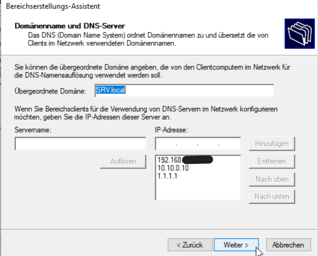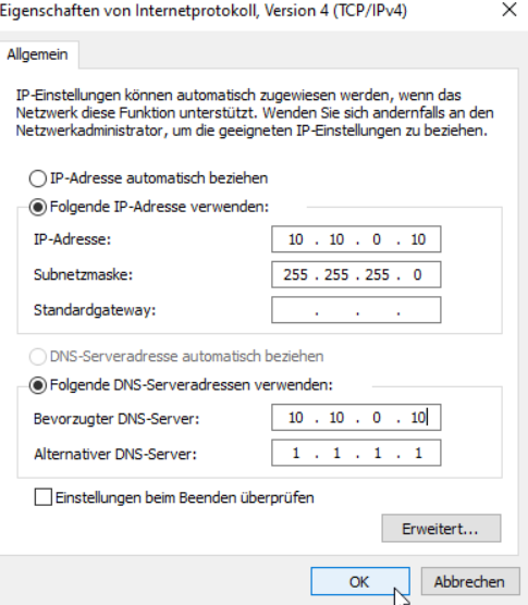 - DNS-Server 10.10.0.10 (IP des Domain Controllers)