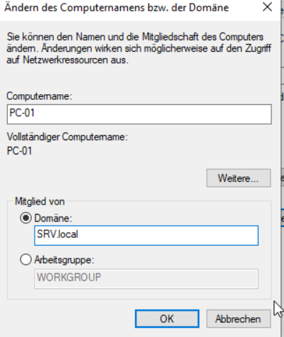 - DNS: Der Client muss als DNS-Server ausschließlich den Domain Controller eingetragen haben. Sonst schlägt der Beitritt fehl.