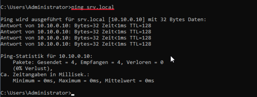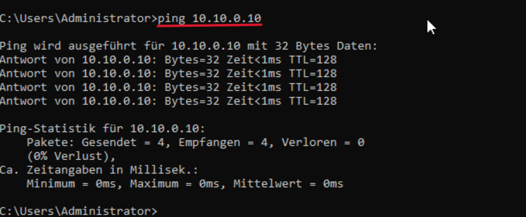 ) ist korrekt eingerichtet und auflösbar. - Der Domain Controller ist erreichbar (Ping auf 10.10.0.10 erfolgreich).